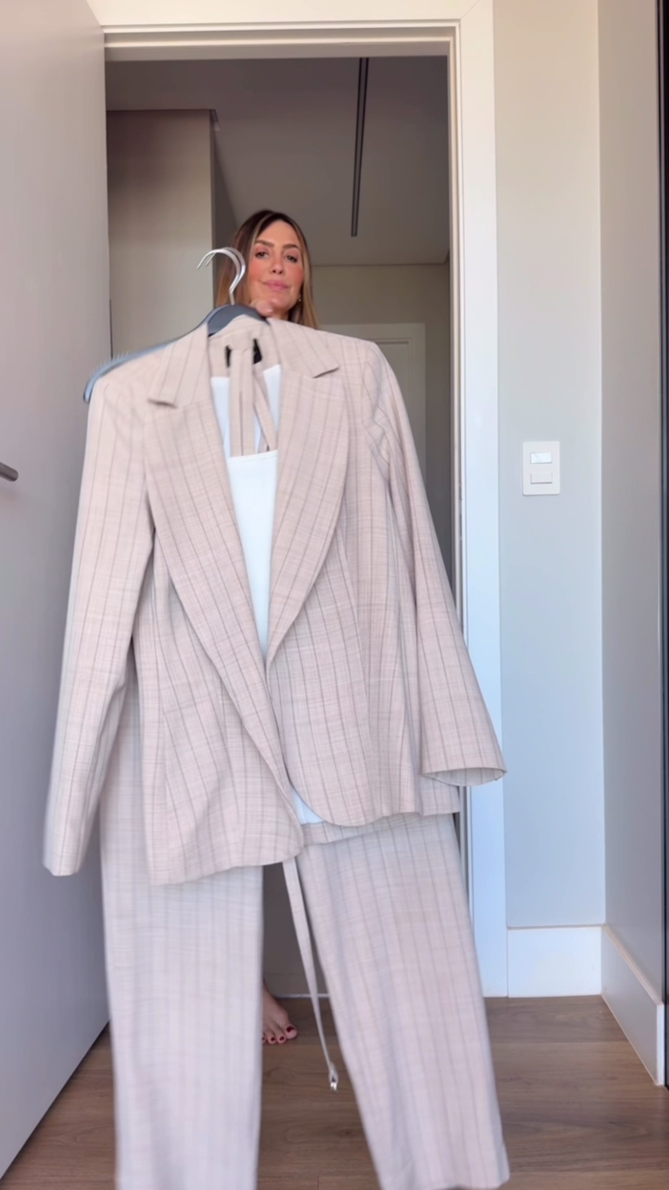 Blazer com estampa risca de giz e design elegante, acompanhado de cinto que permite ajuste na cintura e valoriza a silhueta. A modelagem estruturada oferece conforto ao vestir, enquanto o visual clássico ganha um toque moderno. Calça coordenada disponível, formando um conjunto sofisticado e versátil.